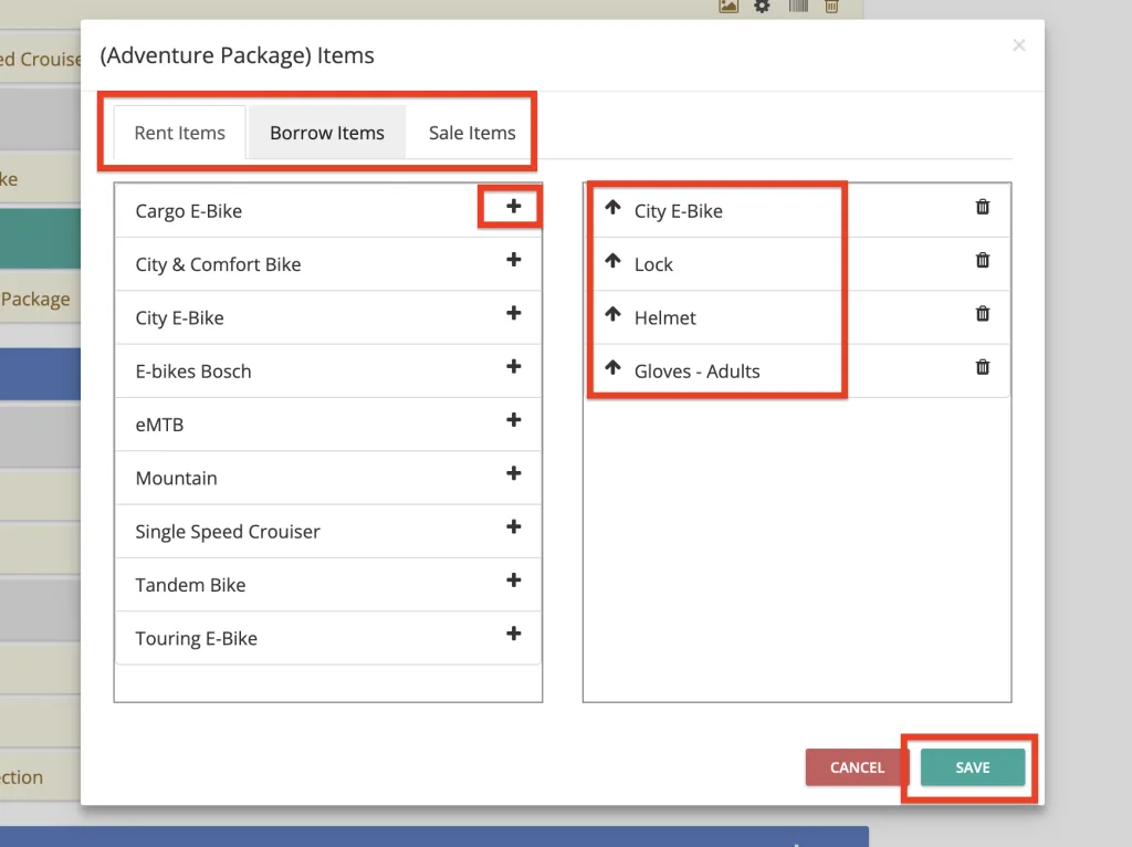 3. Start adding items to the package. Click the Items icon to choose products from any group (Rent, Borrow, or Sale).