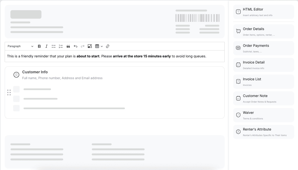 5. Drag the Customer Info component to automatically insert details like customer name, phone number, email, and address.