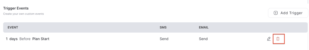 Deleting a trigger means permanently removing an existing reminder trigger from the system. Once deleted, the trigger will no longer send SMS or email reminders for the associated event.