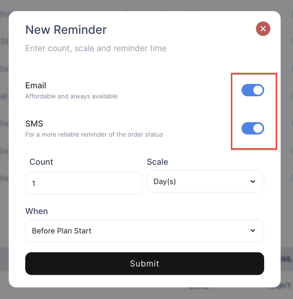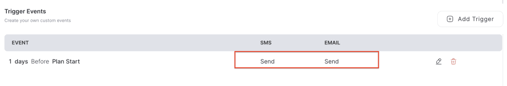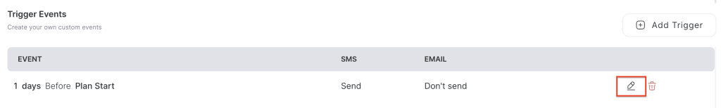 Editing triggers means modifying the settings of an existing reminder trigger, such as changing the time, notification type (SMS, Email, or both), or the event (Plan Start or Plan Finish) that activates the reminder.