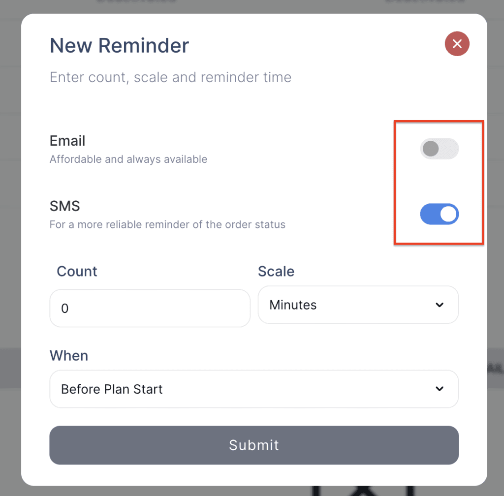 3. Turn on the toggle to set the reminder as SMS only, Email only, or Both SMS & Email.