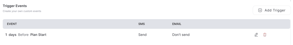 Example: You can set a trigger to send a Start Reminder 2 hours before the plan begins, or a Finish Reminder 1 day before the plan ends.