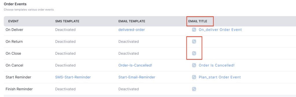 The email title is the subject line that customers see when they receive the email. It can be customized and set based on specific events (e.g., order confirmation, plan start, plan finish).