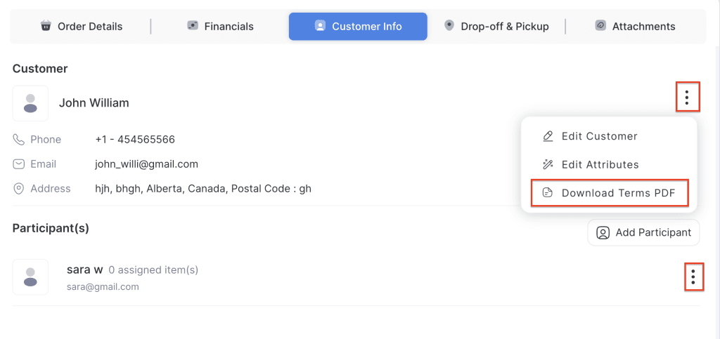 The Download Signed Terms & Conditions feature allows staff to retrieve a copy of the signed agreement for both the main customer and any participants linked to the order. This ensures that a record of signed agreements is always available for reference, compliance, or dispute resolution.
