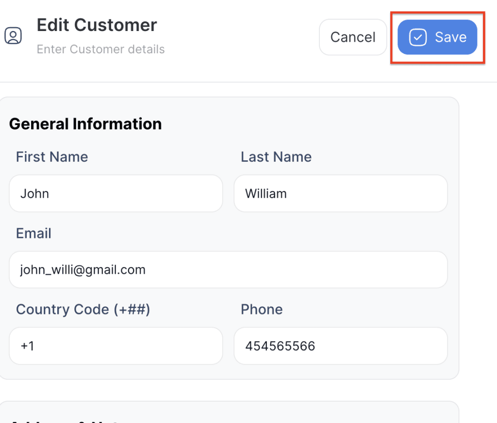 6. Click on Save to save the changes. Any changes made in the customer profile will automatically update in the order.