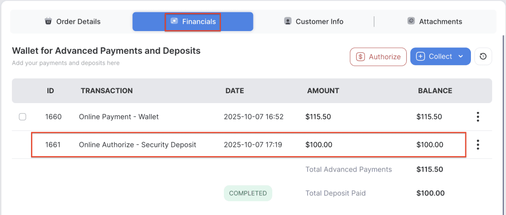 4. Go to the Financials tab. The customer card on file will automatically authorize the amount at the time of delivery.