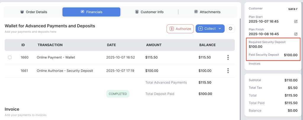 The Auto Hold on Card for Security Deposit feature automatically authorizes the customer’s card on file for the security deposit when items are delivered. This ensures that a pre-approved amount is held to cover potential damages, losses, or incomplete returns, without requiring manual authorization.