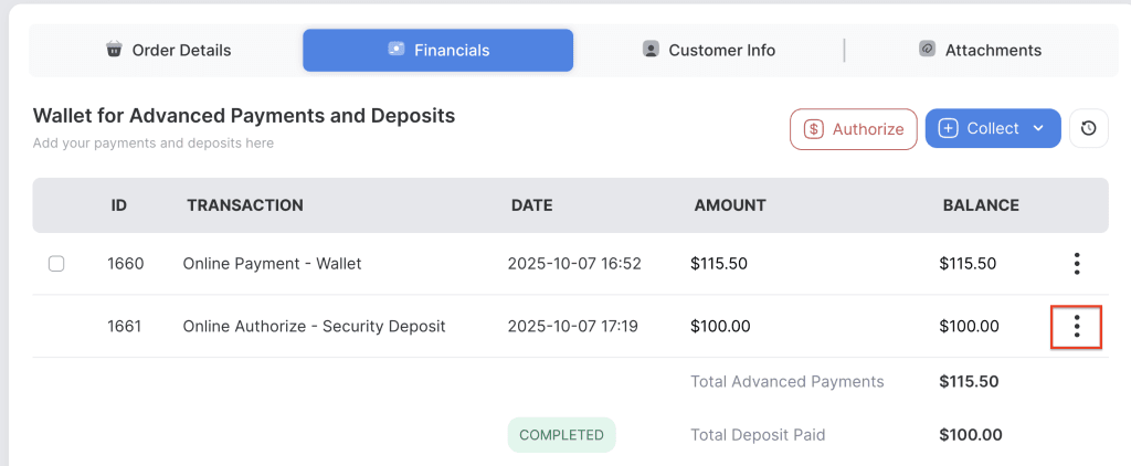 4. Click on the three-dot menu next to the authorized amount you want to void.