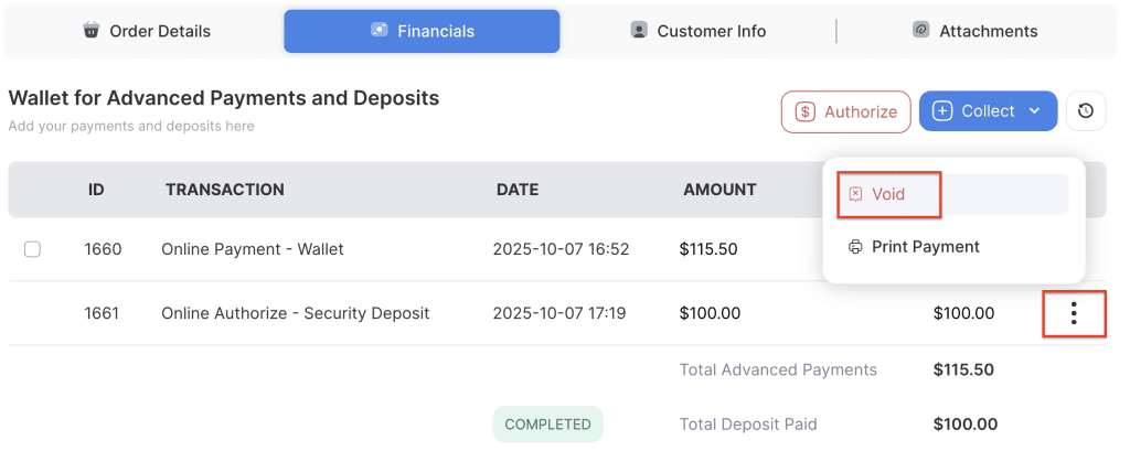 The Void Authorized Amount feature allows businesses to cancel a previously authorized payment. Depending on the system settings, the authorization can be voided automatically after the order is returned, or manually using the void option to release the held amount.