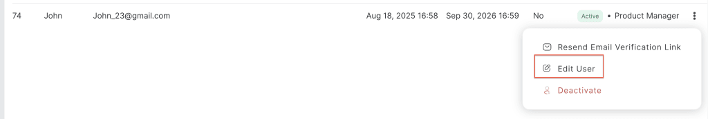 Once the user is created, Click on the 3 dot menu and click on edit user.